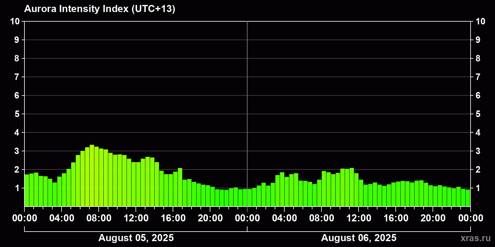Changes in the auroral intensity index from 2025-08-05 to 2025-08-06 local time