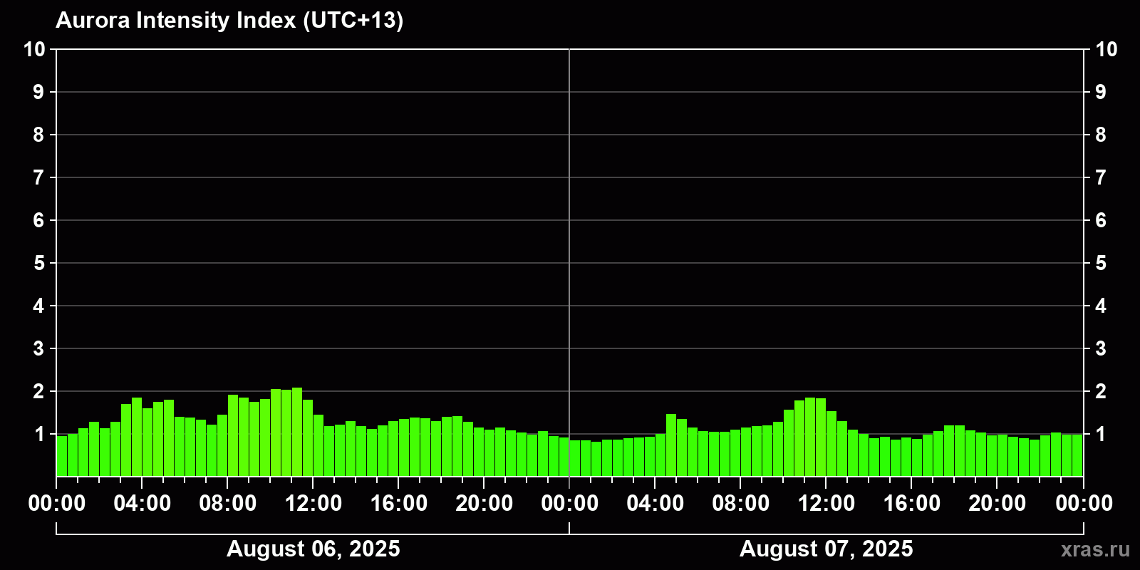 Changes in the auroral intensity index from 2025-08-06 to 2025-08-07 local time