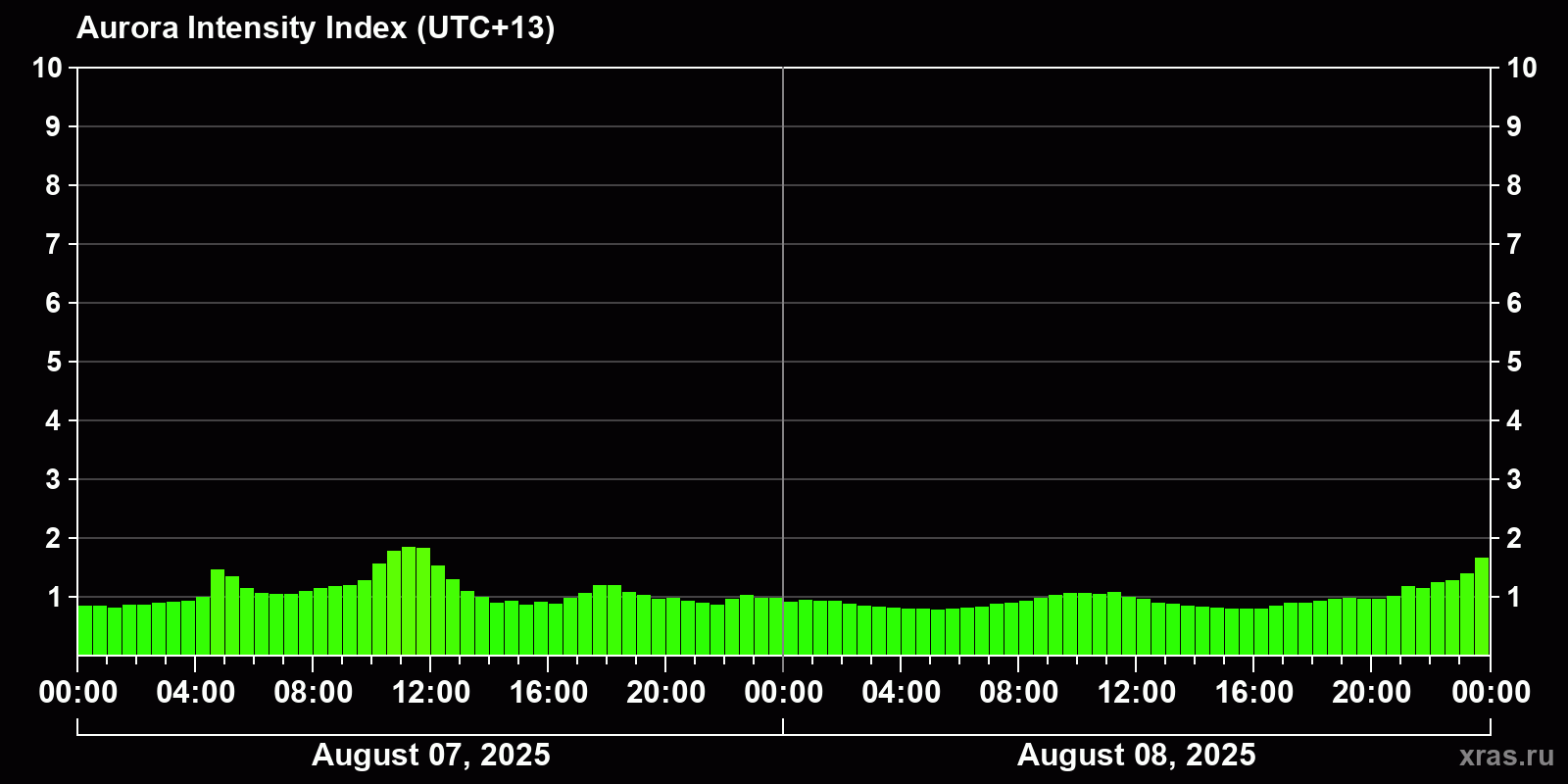Changes in the auroral intensity index from 2025-08-07 to 2025-08-08 local time