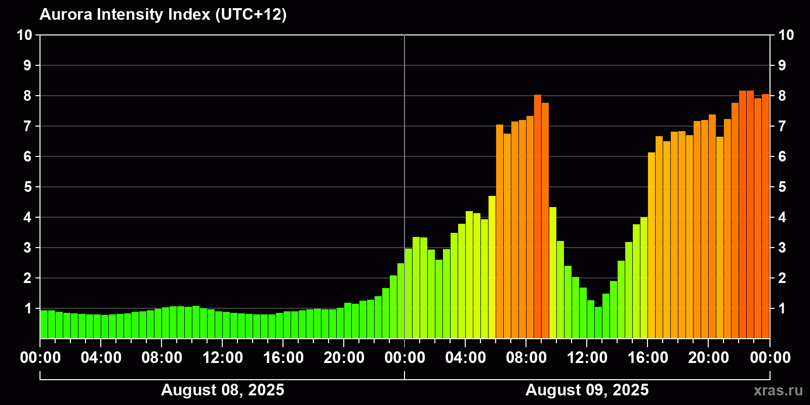 Changes in the auroral intensity index from 2025-08-09 to 2025-08-10 local time