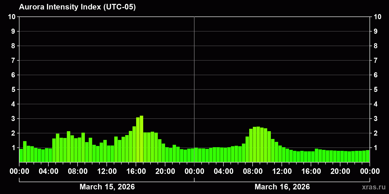 Changes in the auroral intensity index from 2026-03-15 to 2026-03-16 local time
