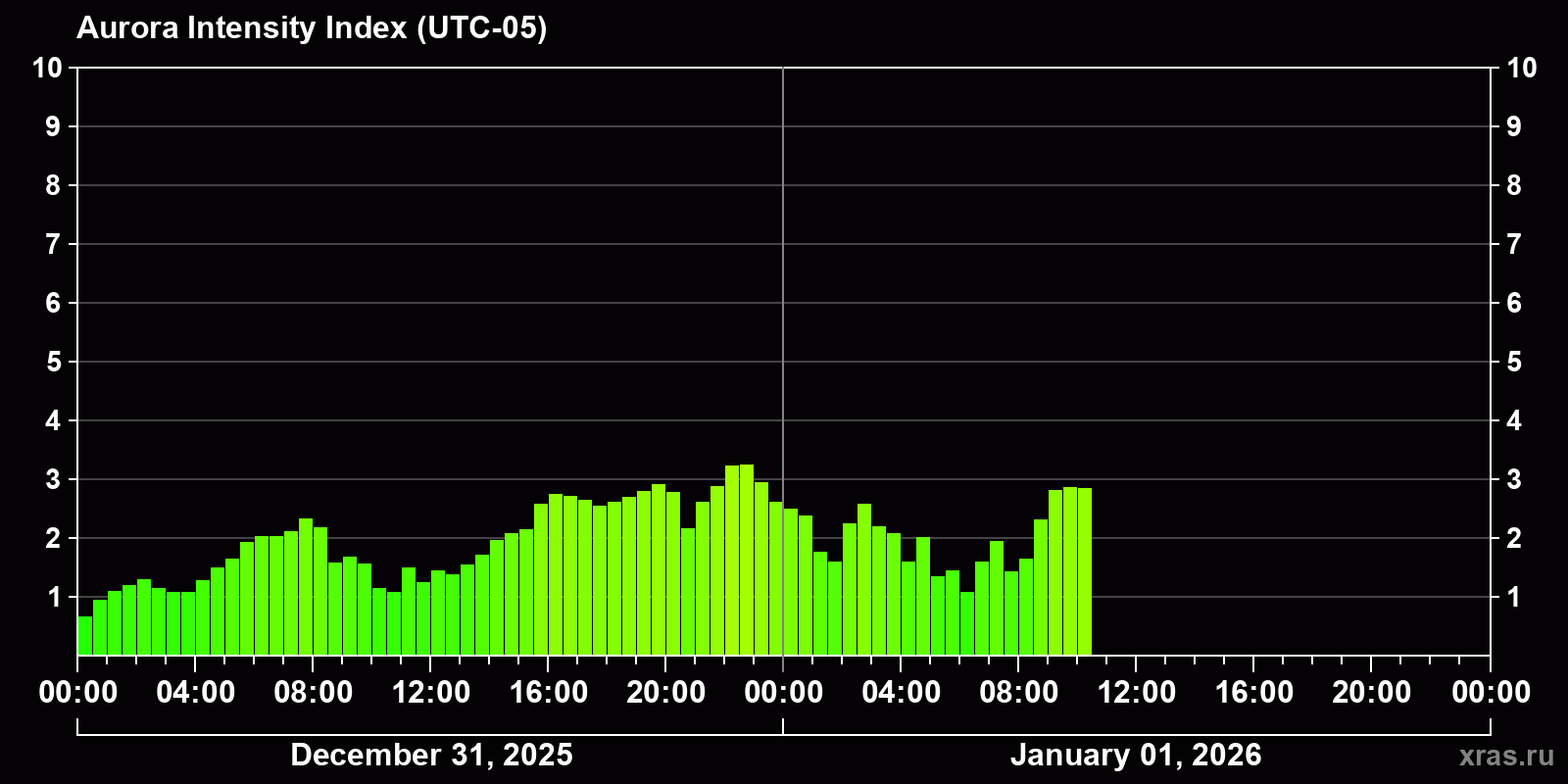 Auroral intensity index and the theoretically possible latitude of observations for nighttime in the Western Hemisphere as of 2026-01-01 08:17 (end of day) local time