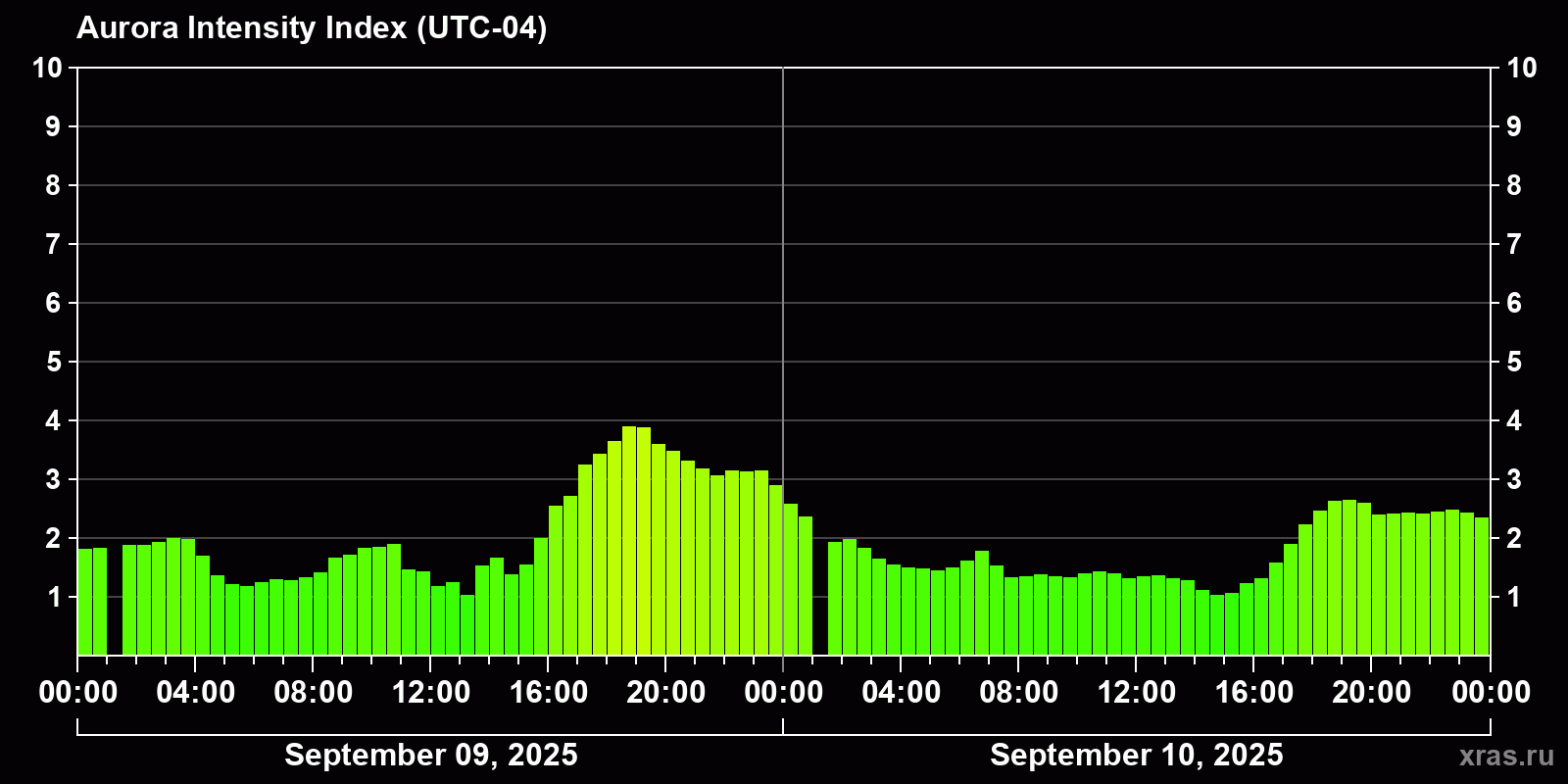 Auroral intensity index and the theoretically possible latitude of observations for nighttime in the Western Hemisphere as of 2025-09-10 23:48 (end of day) local time