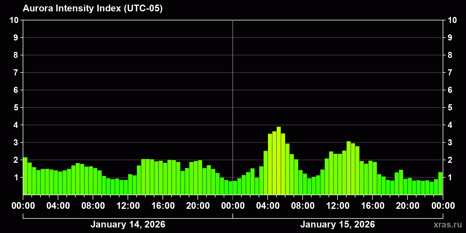 Auroral intensity index and the theoretically possible latitude of observations for nighttime in the Western Hemisphere as of 2026-01-15 23:45 (end of day) local time