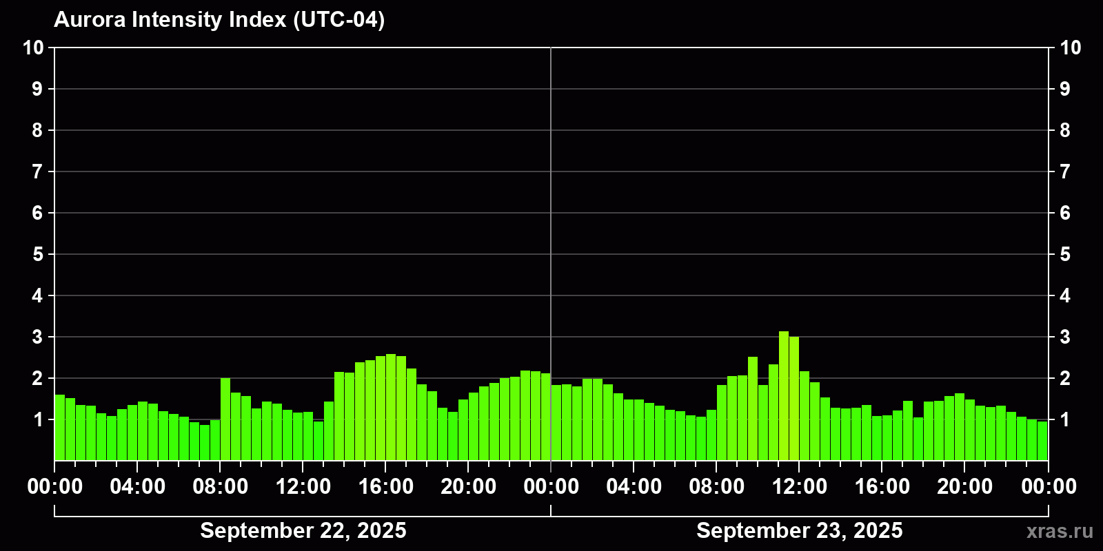 Changes in the auroral intensity index from 2025-09-22 to 2025-09-23 local time