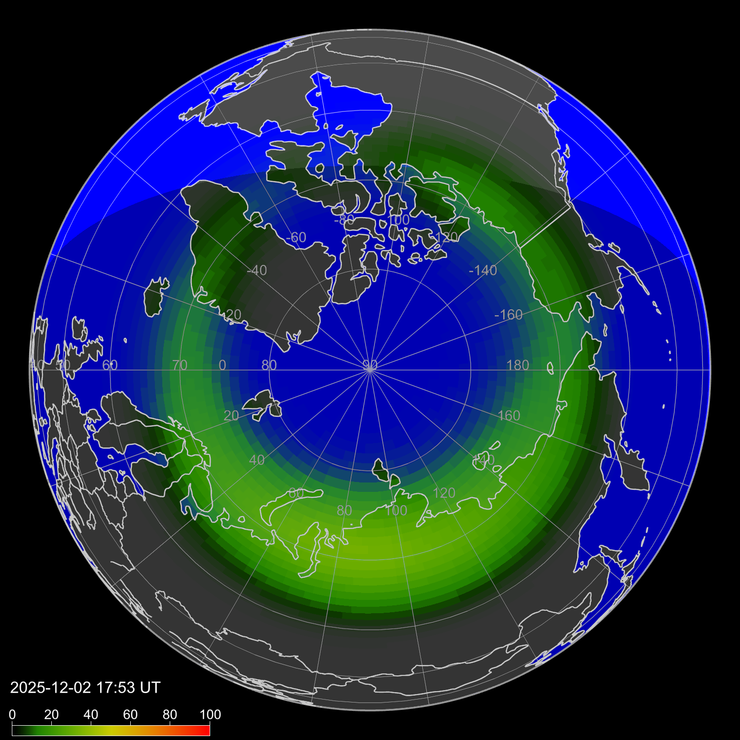 Изменения и часовой прогноз индекса интенсивности полярных сияний с 2025-11-30 по 2025-12-01