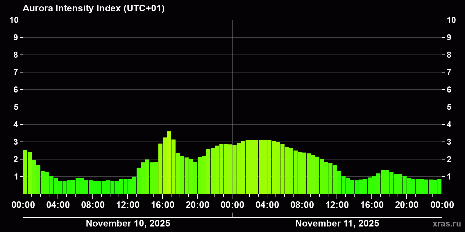 Auroral intensity index and the theoretically possible latitude of observations for nighttime in the Estern Hemisphere as of 2025-11-11 23:45 (end of day) local time