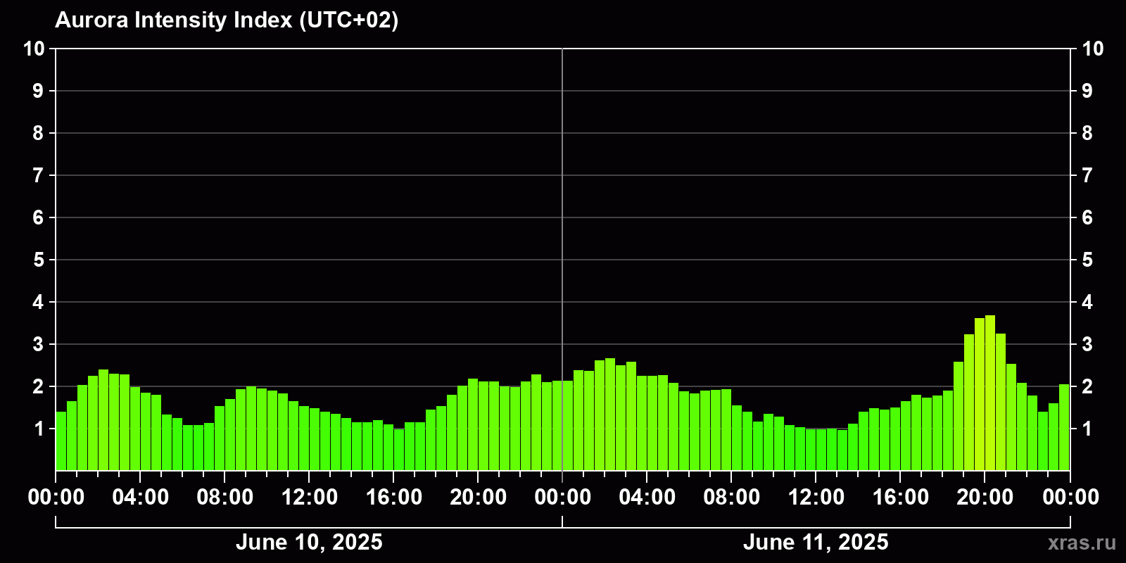 Auroral intensity index and the theoretically possible latitude of observations for nighttime in the Estern Hemisphere as of 2025-06-11 23:58 (end of day) local time