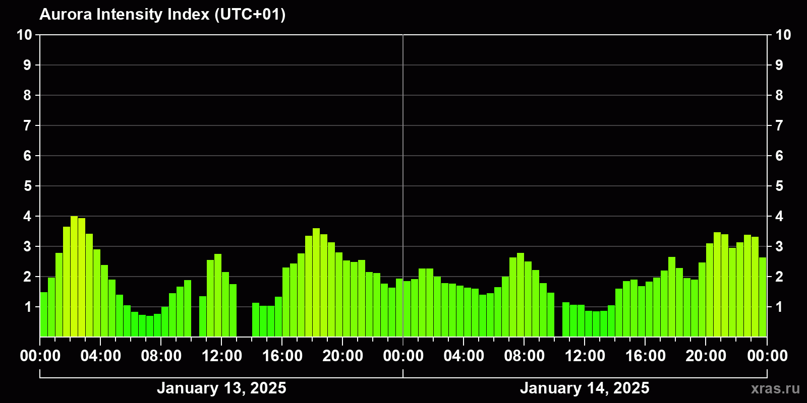 Changes in the auroral intensity index from 2025-01-13 to 2025-01-14 local time