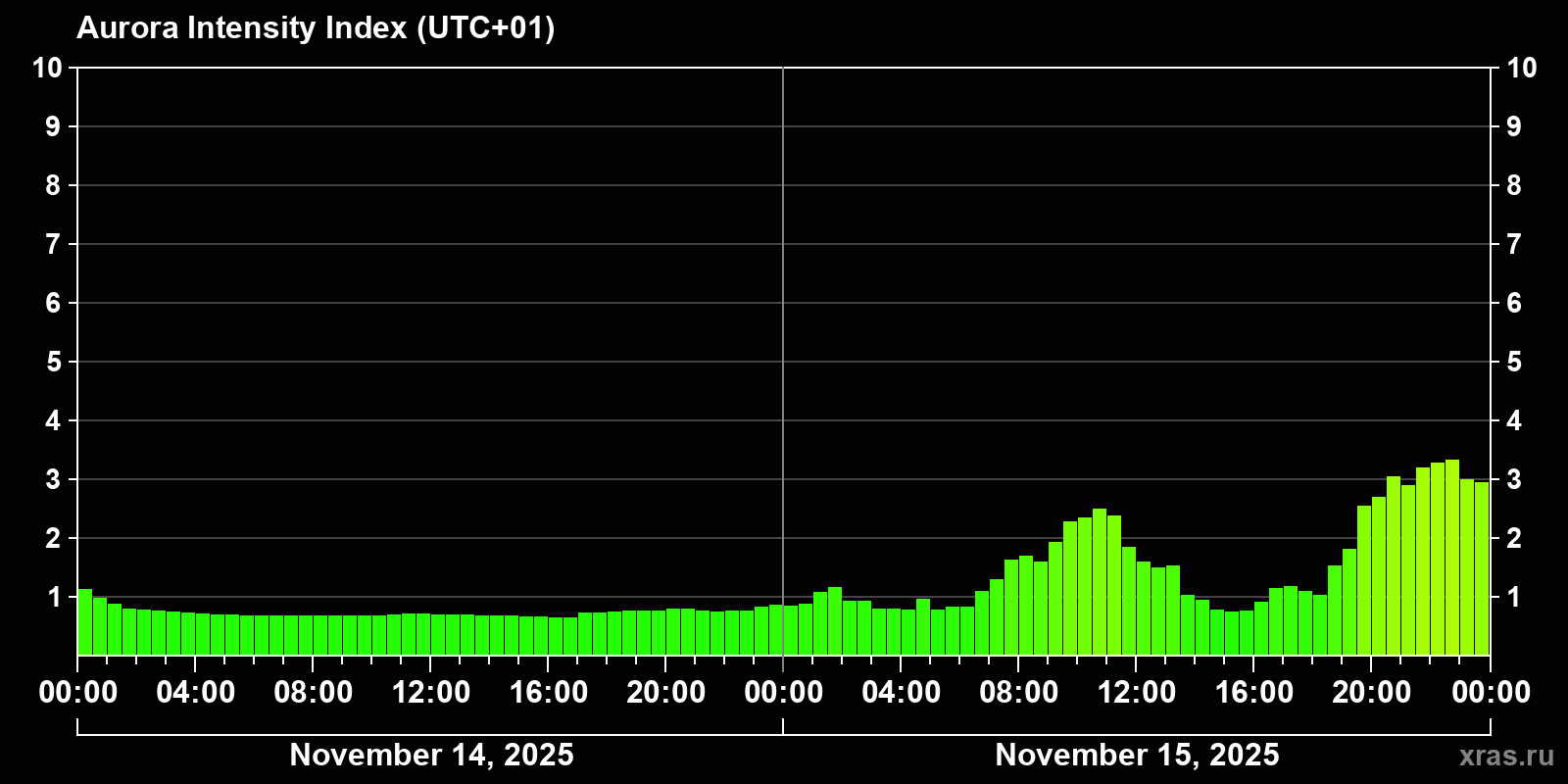 Changes in the auroral intensity index from 2025-11-14 to 2025-11-15 local time