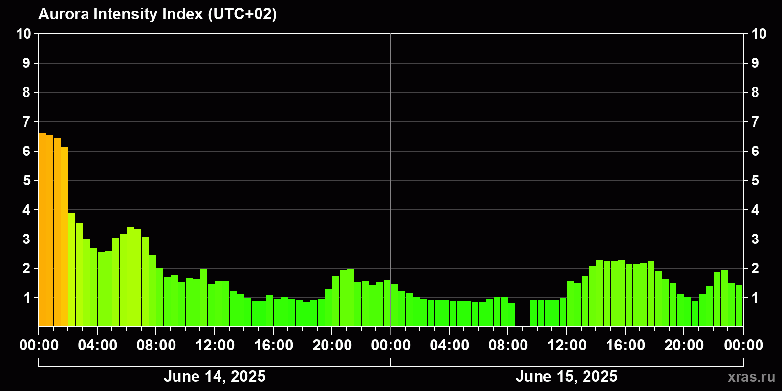 Auroral intensity index and the theoretically possible latitude of observations for nighttime in the Estern Hemisphere as of 2025-06-15 23:48 (end of day) local time