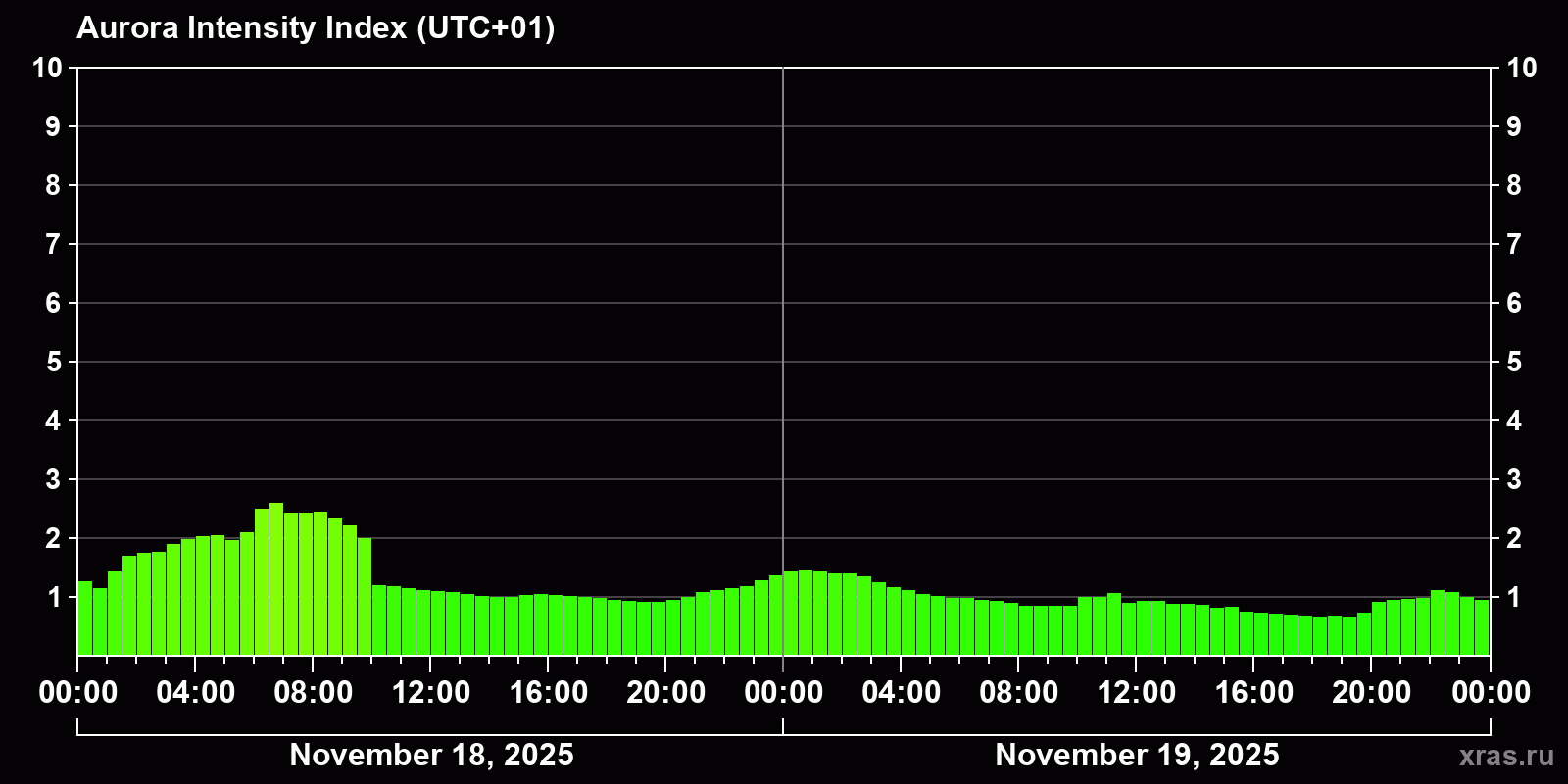 Changes in the auroral intensity index from 2025-11-18 to 2025-11-19 local time