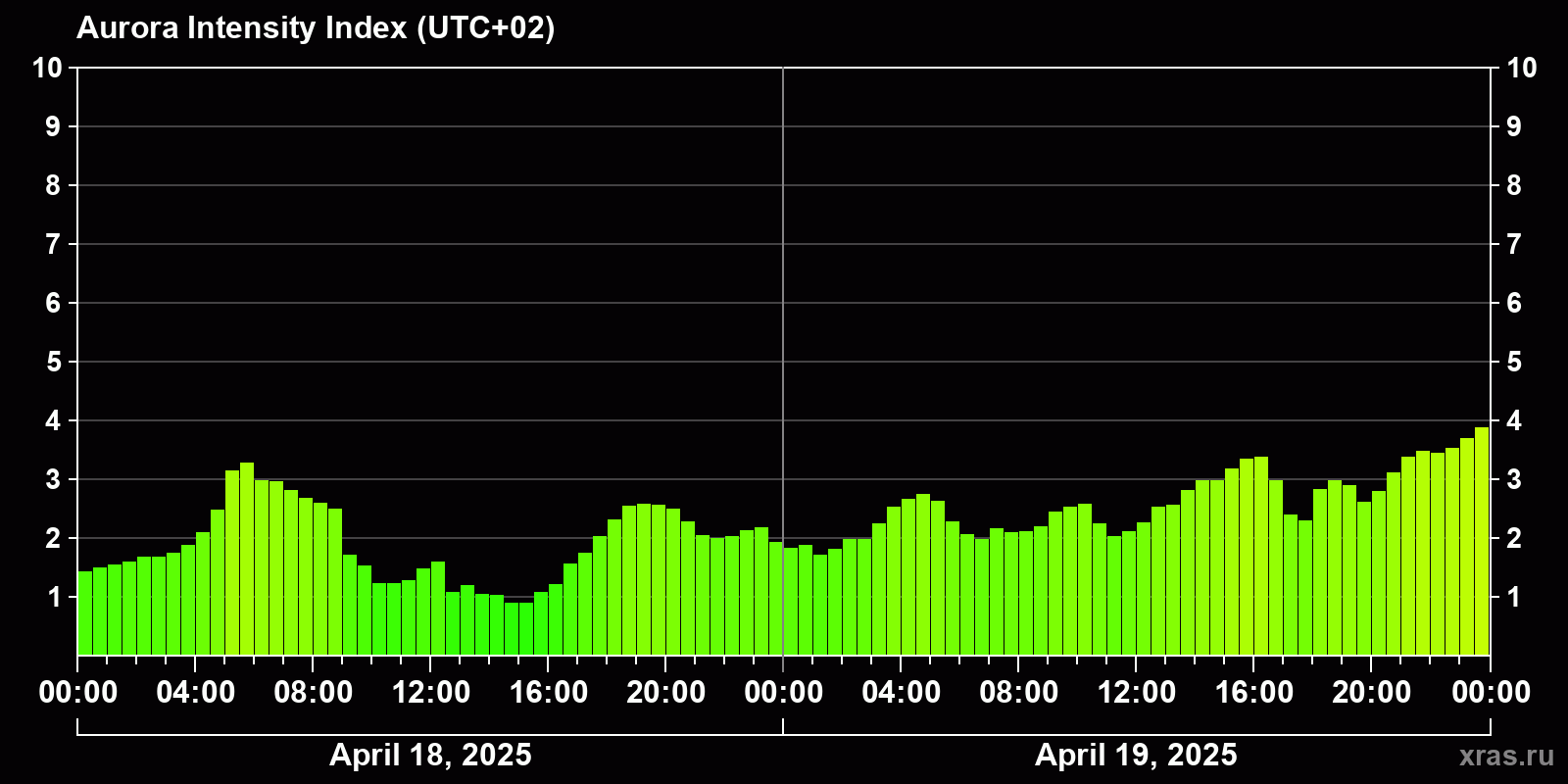 Changes in the auroral intensity index from 2025-04-18 to 2025-04-19 local time
