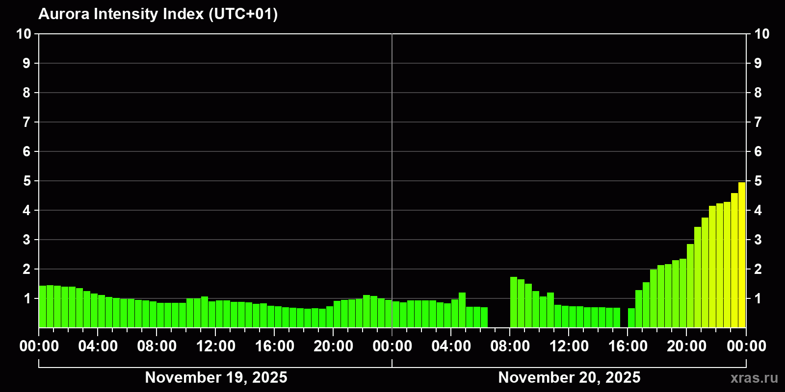 Auroral intensity index and the theoretically possible latitude of observations for nighttime in the Estern Hemisphere as of 2025-11-20 23:45 (end of day) local time