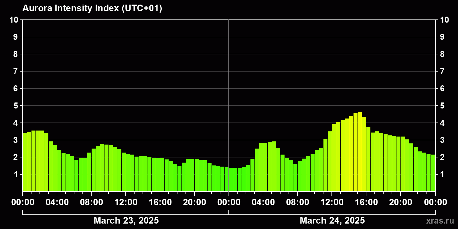 Auroral intensity index and the theoretically possible latitude of observations for nighttime in the Estern Hemisphere as of 2025-03-24 23:47 (end of day) local time