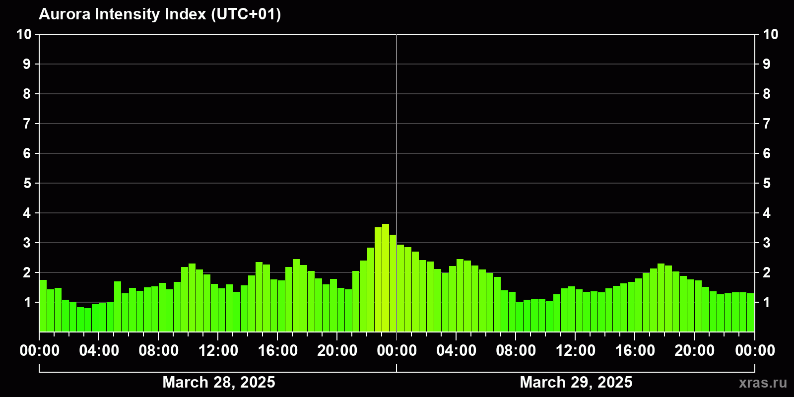 Changes in the auroral intensity index from 2025-03-28 to 2025-03-29 local time
