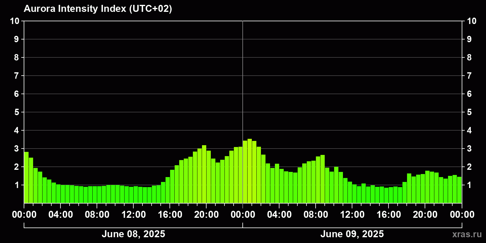 Auroral intensity index and the theoretically possible latitude of observations for nighttime in the Estern Hemisphere as of 2025-06-09 23:57 (end of day) local time