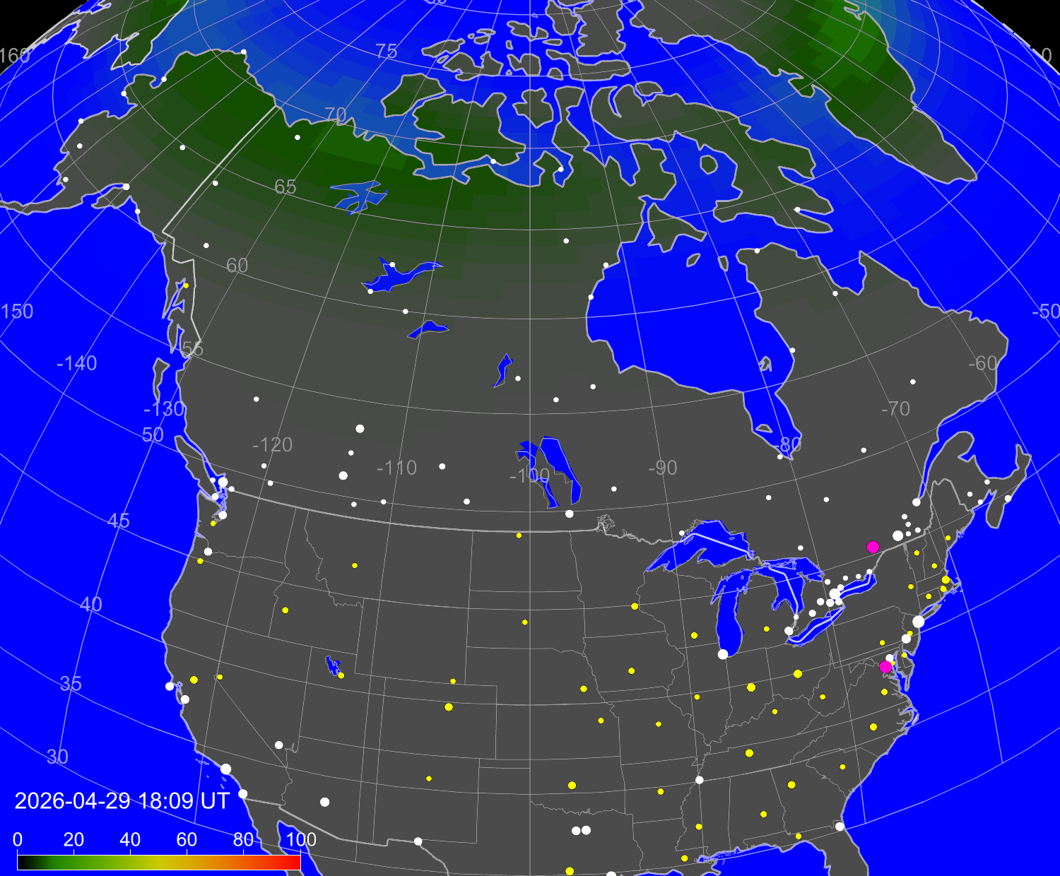 Probability of northern lights (auroras) in cities of United States