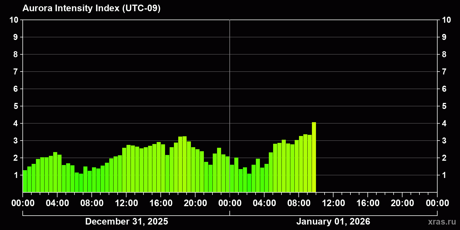 Auroral intensity index and the theoretically possible latitude of observations for nighttime in the Western Hemisphere as of 2026-01-01 08:01 (end of day) local time