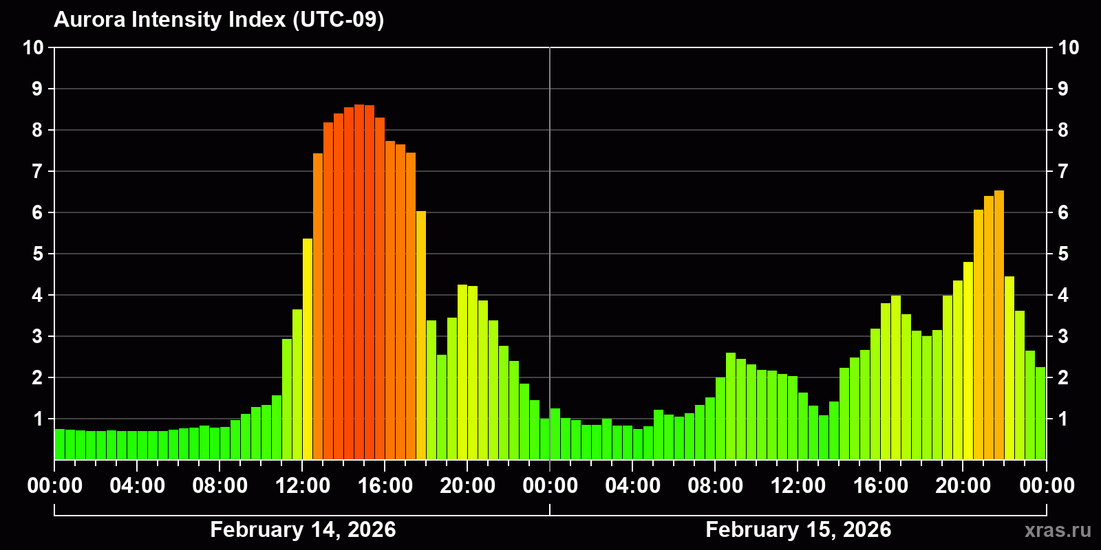Changes in the auroral intensity index from 2026-02-14 to 2026-02-15 local time