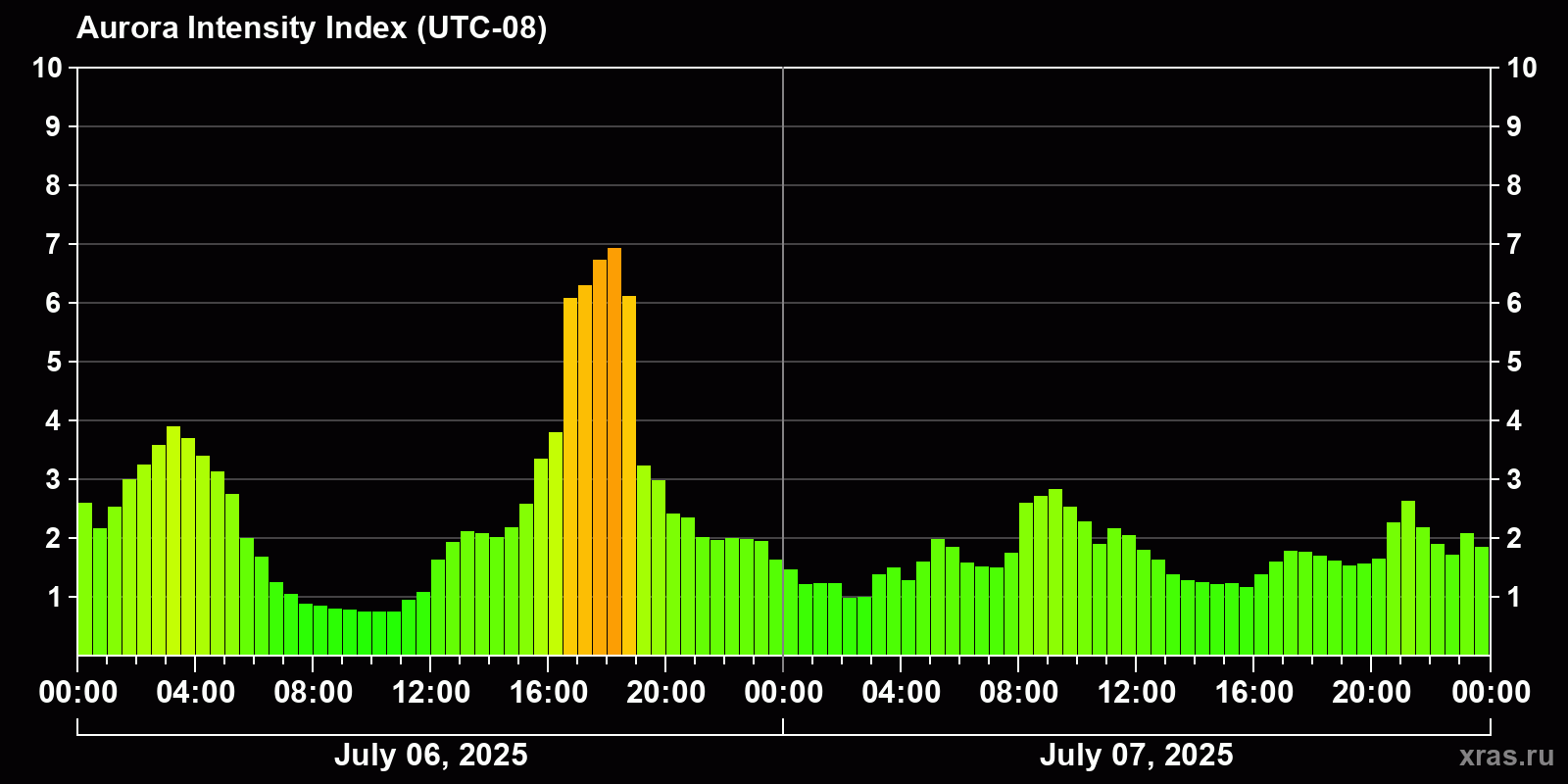 Changes in the auroral intensity index from 2025-07-06 to 2025-07-07 local time