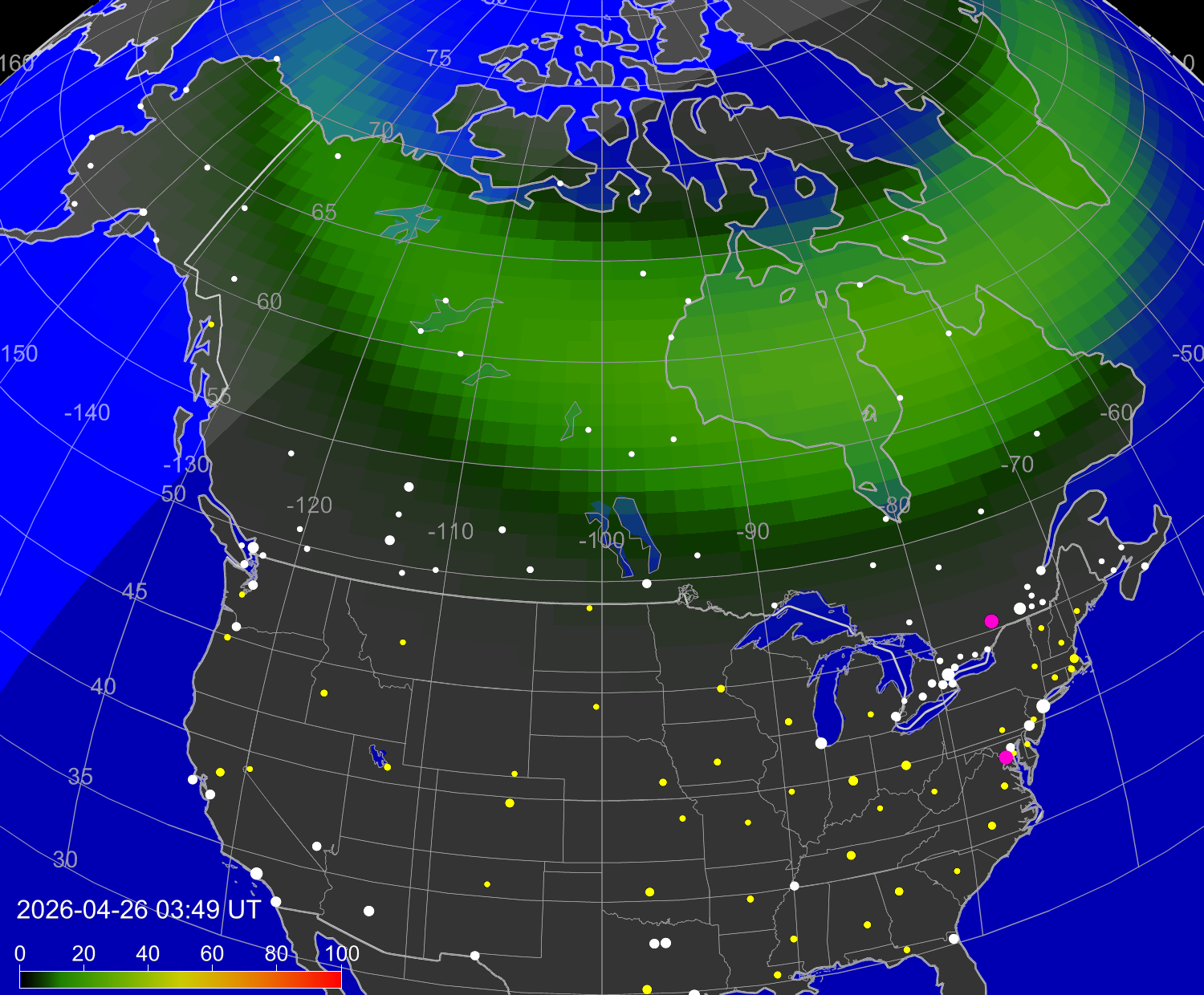 Probability of northern lights (auroras) in cities of United States