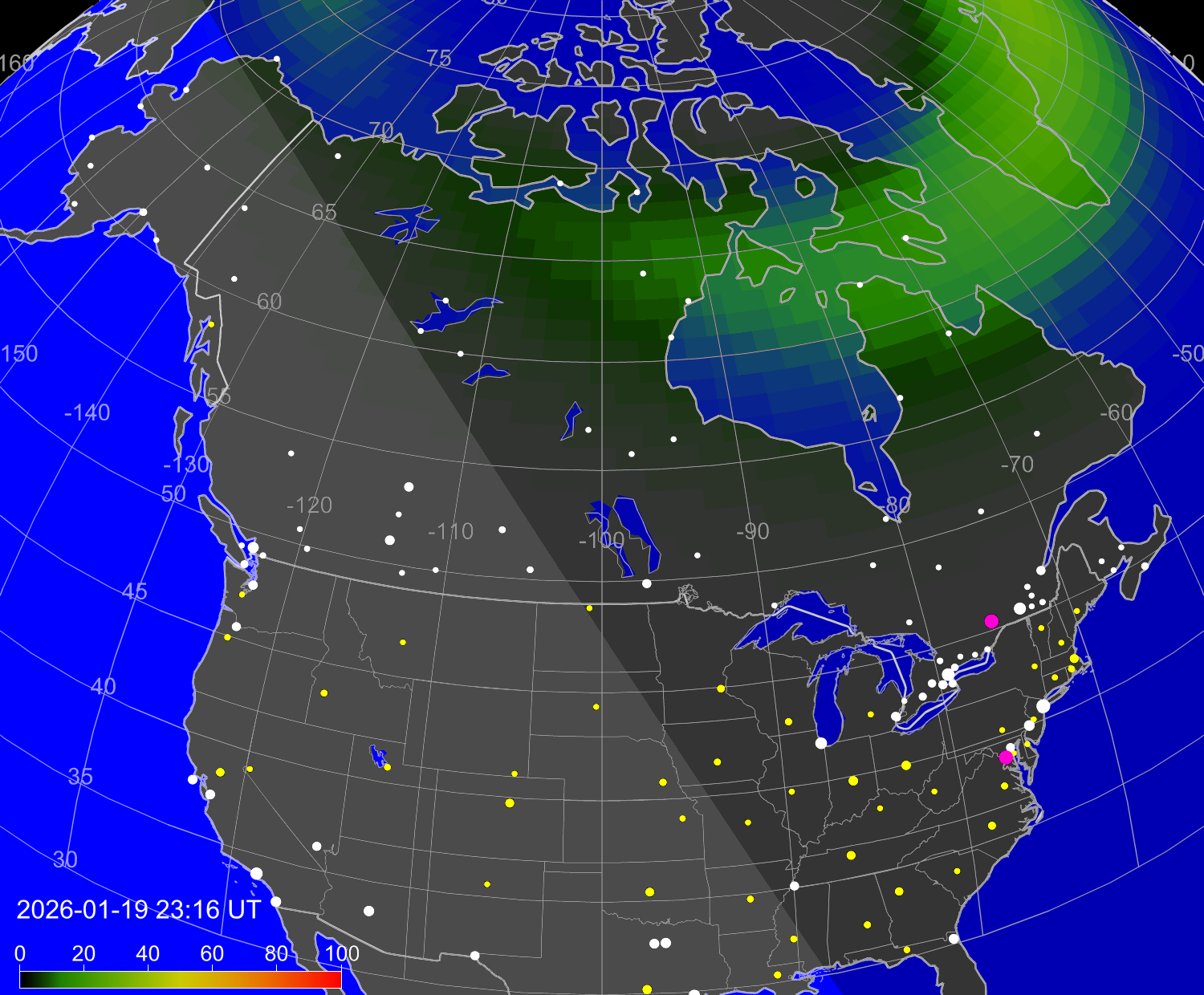 Индекс интенсивности полярных сияний и теоретически возможная широта наблюдений для ночного времени в западном полушарии