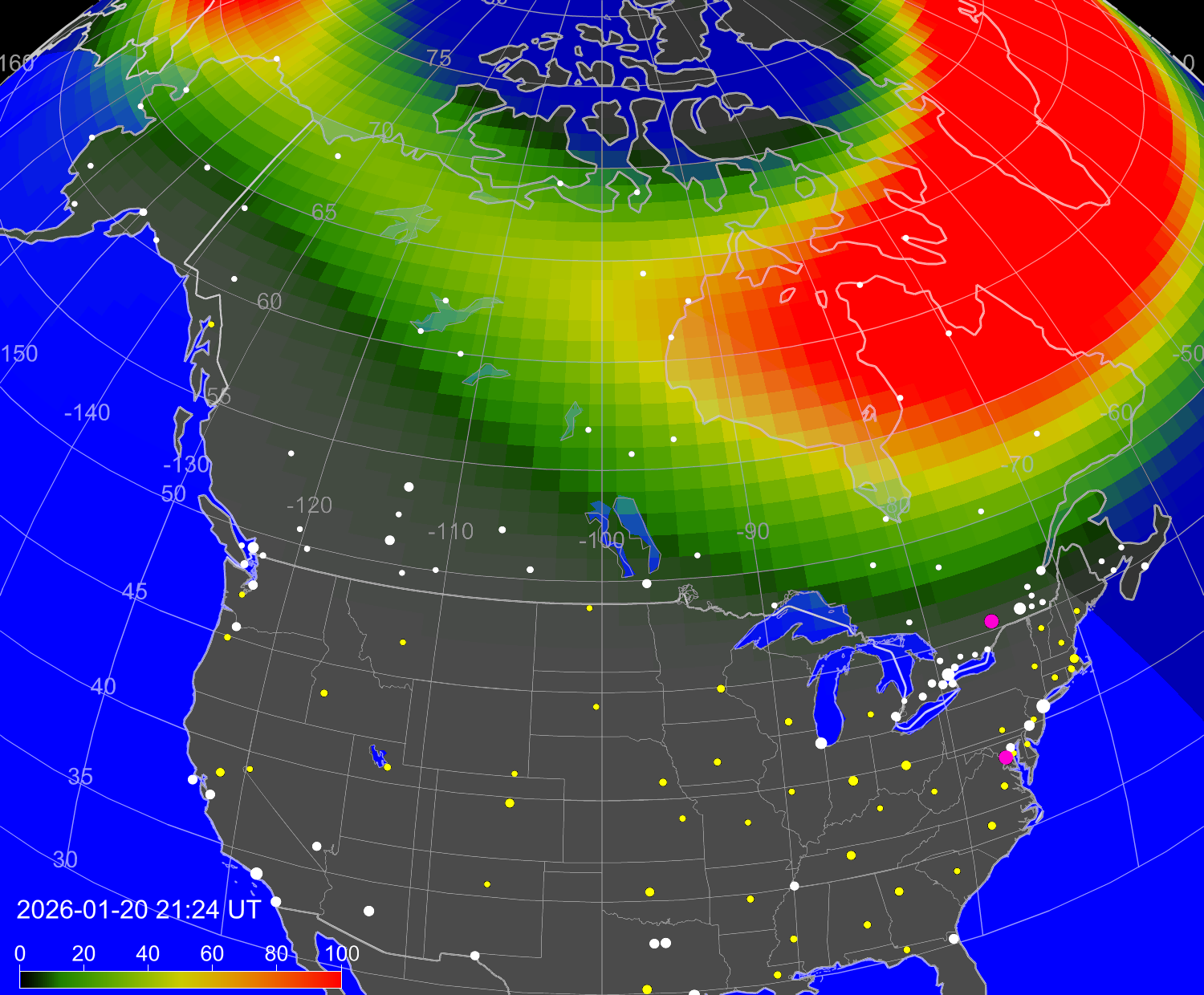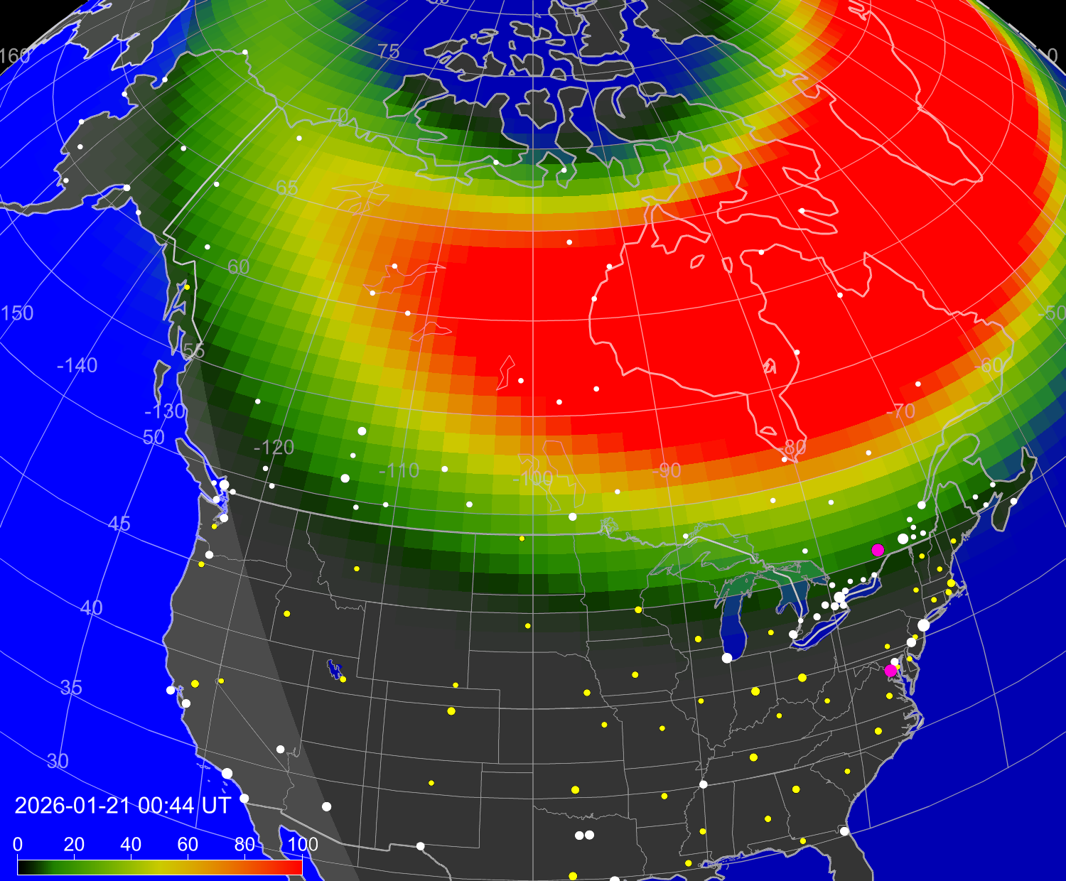 Изменения и часовой прогноз индекса интенсивности полярных сияний с 2026-01-20 по 2026-01-21