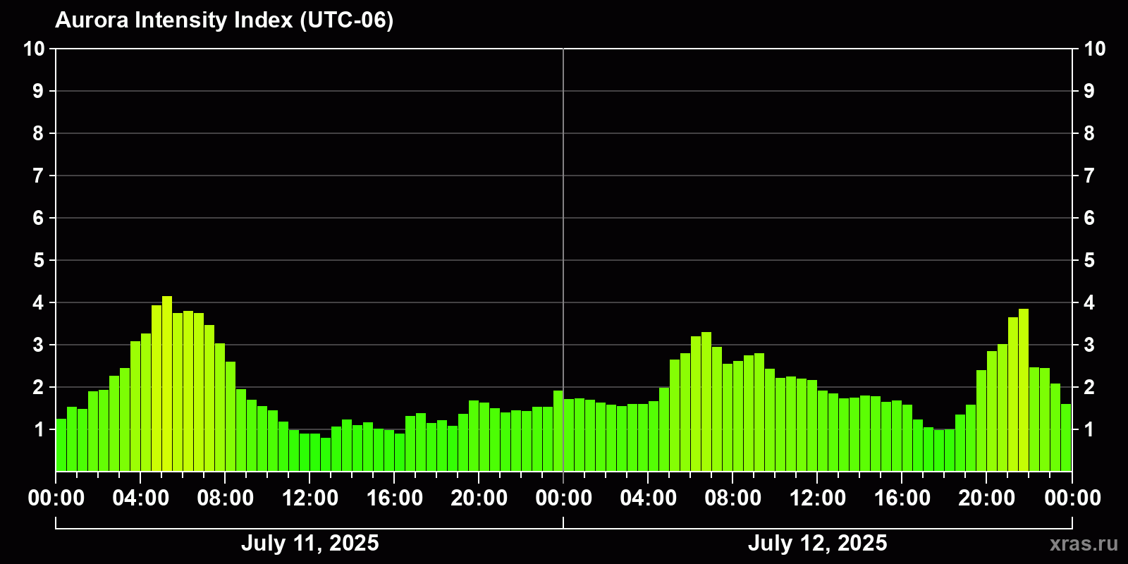 Auroral intensity index and the theoretically possible latitude of observations for nighttime in the Western Hemisphere as of 2025-07-12 23:55 (end of day) local time