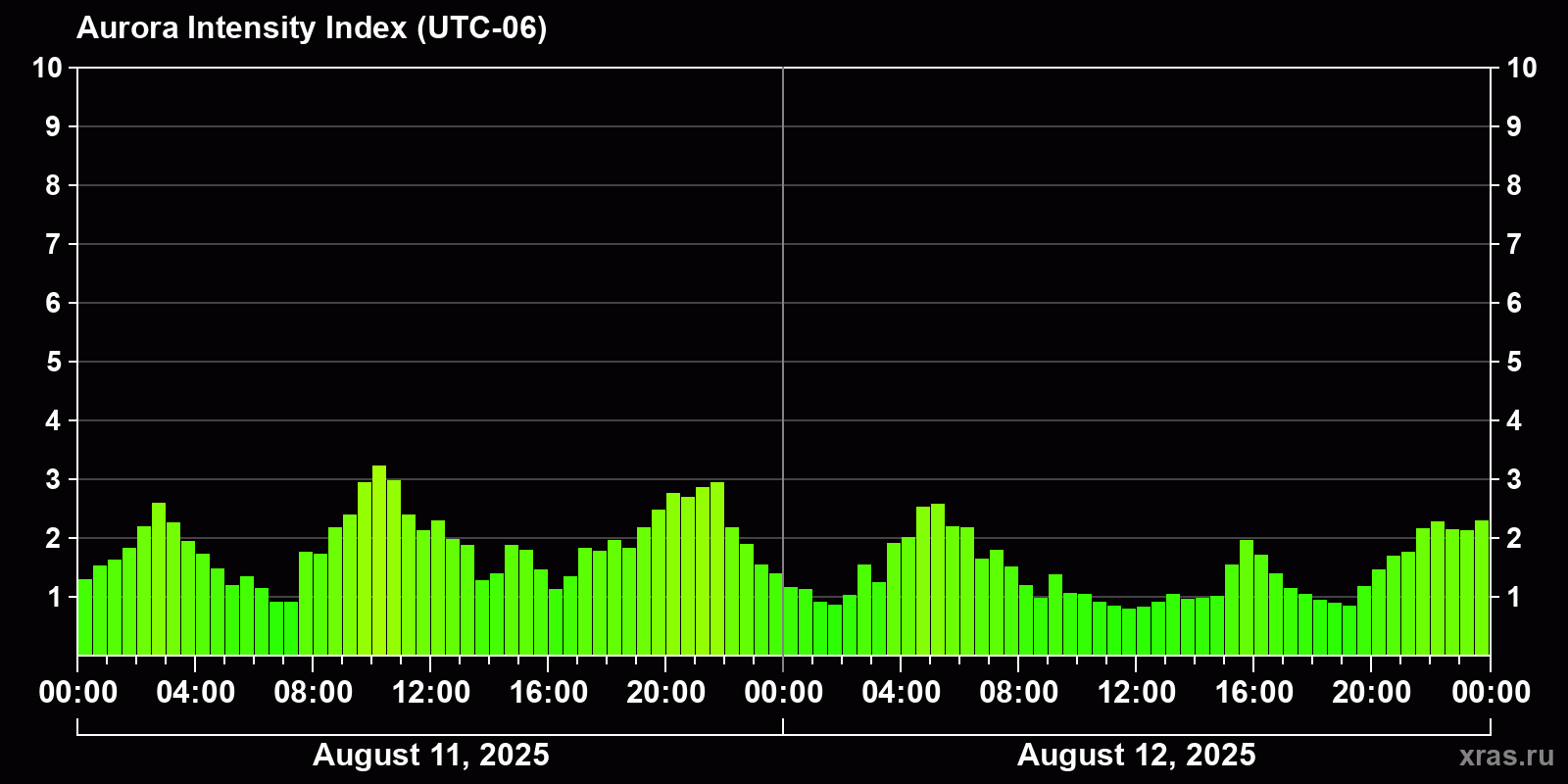 Auroral intensity index and the theoretically possible latitude of observations for nighttime in the Western Hemisphere as of 2025-08-12 23:46 (end of day) local time