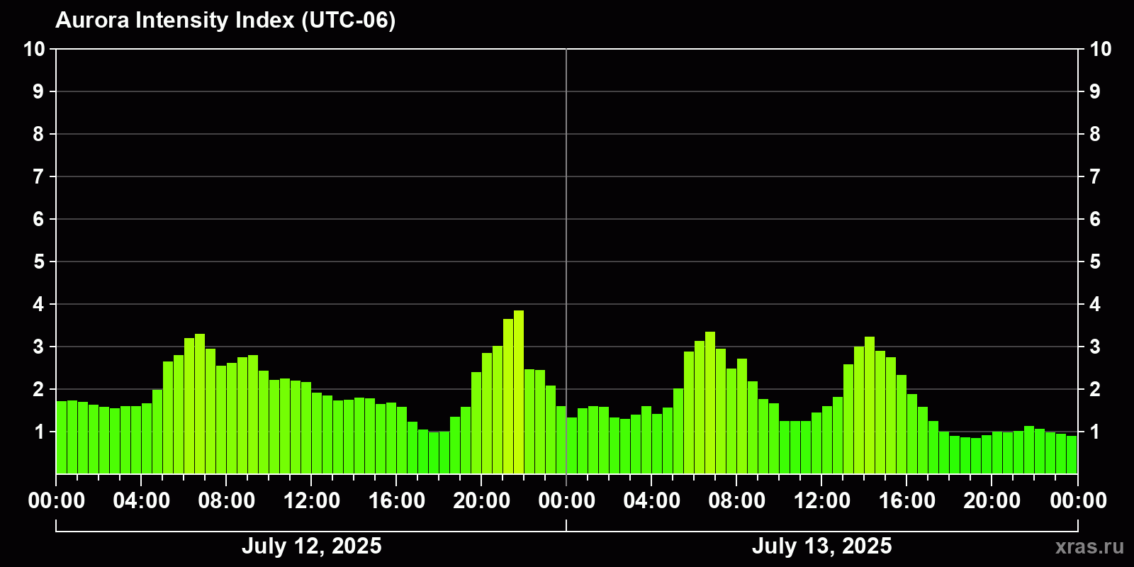 Changes in the auroral intensity index from 2025-07-12 to 2025-07-13 local time