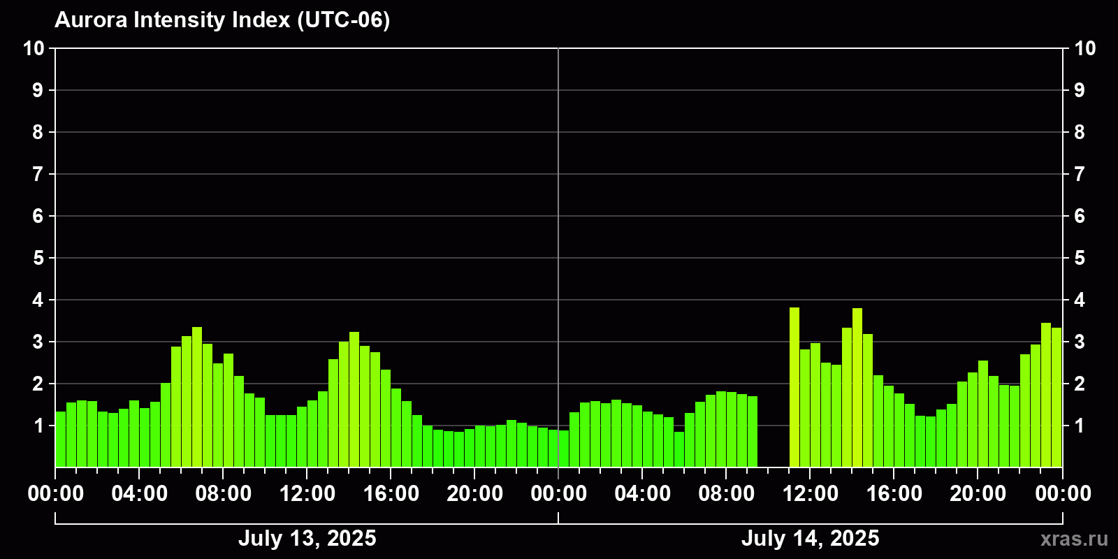 Changes in the auroral intensity index from 2025-07-13 to 2025-07-14 local time