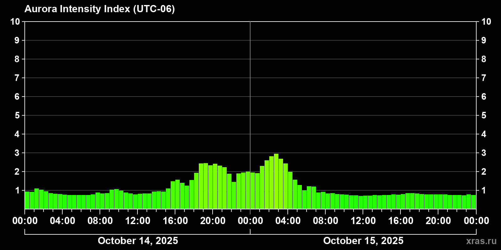 Auroral intensity index and the theoretically possible latitude of observations for nighttime in the Western Hemisphere as of 2025-10-15 23:53 (end of day) local time
