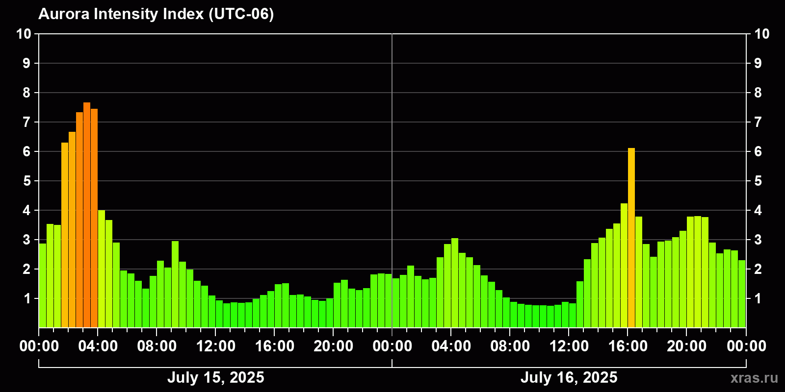 Auroral intensity index and the theoretically possible latitude of observations for nighttime in the Western Hemisphere as of 2025-07-16 23:54 (end of day) local time