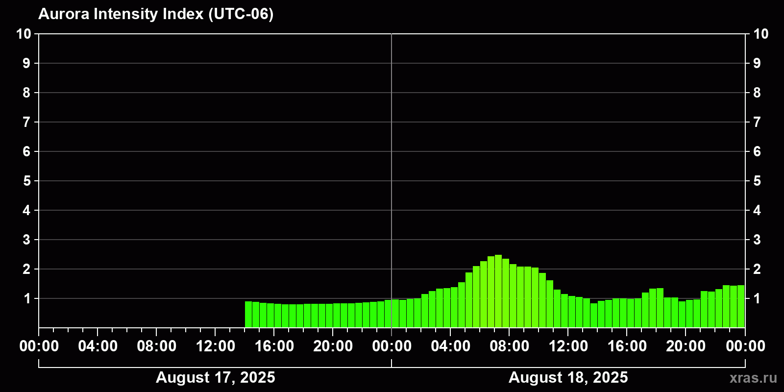 Changes in the auroral intensity index from 2025-08-17 to 2025-08-18 local time