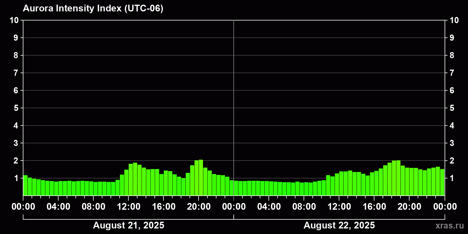 Auroral intensity index and the theoretically possible latitude of observations for nighttime in the Western Hemisphere as of 2025-08-22 23:45 (end of day) local time