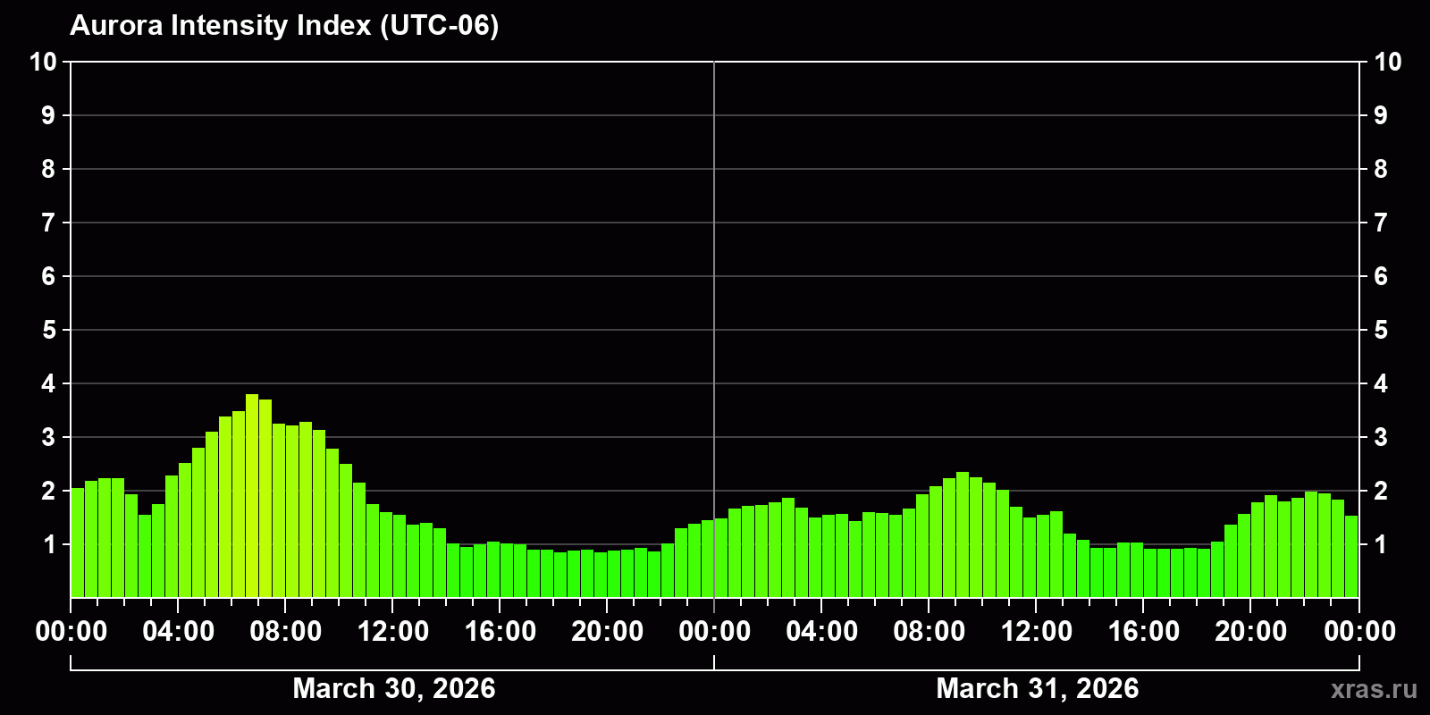 Changes in the auroral intensity index from 2026-03-30 to 2026-03-31 local time