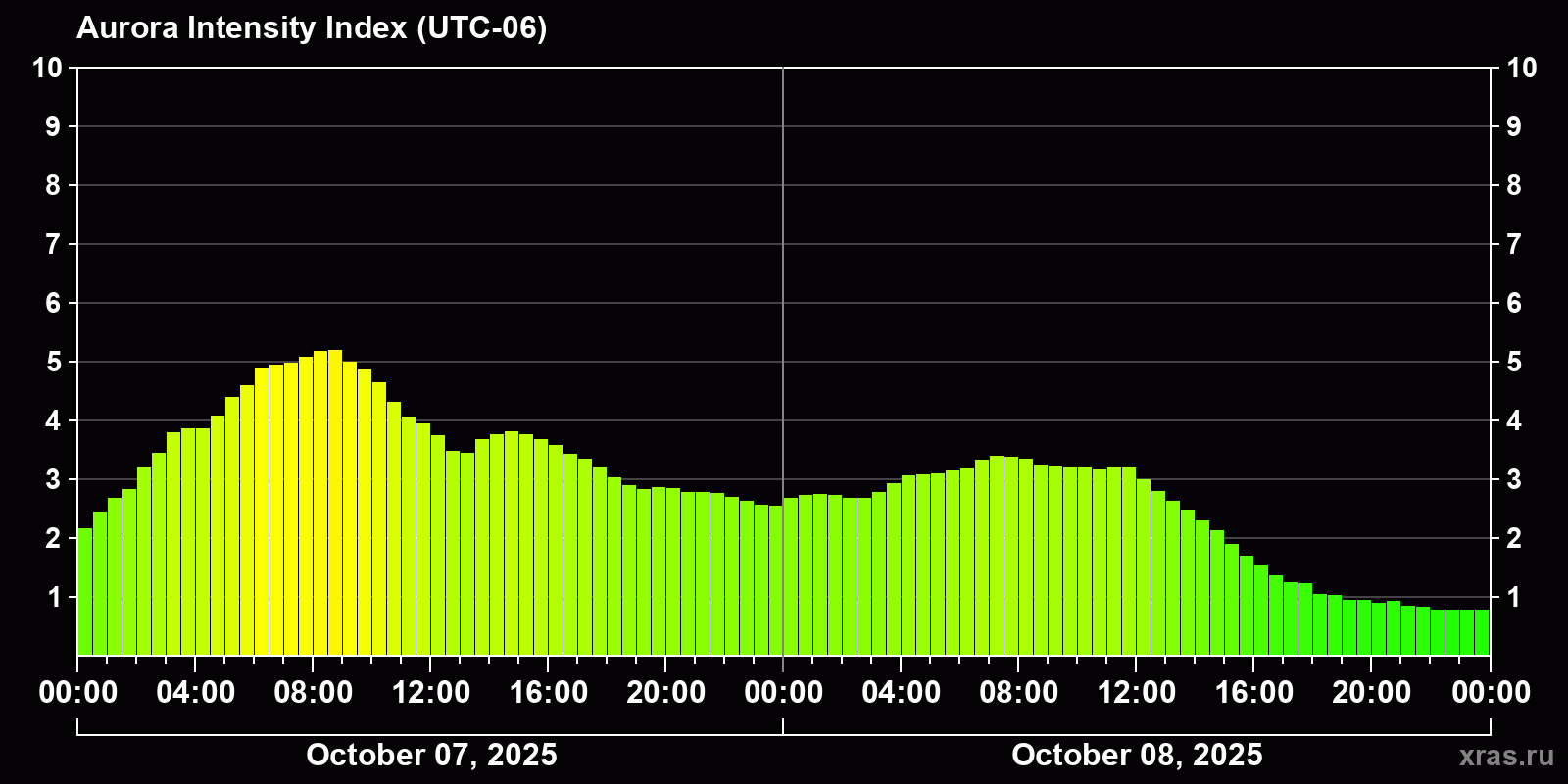 Auroral intensity index and the theoretically possible latitude of observations for nighttime in the Western Hemisphere as of 2025-10-08 23:46 (end of day) local time