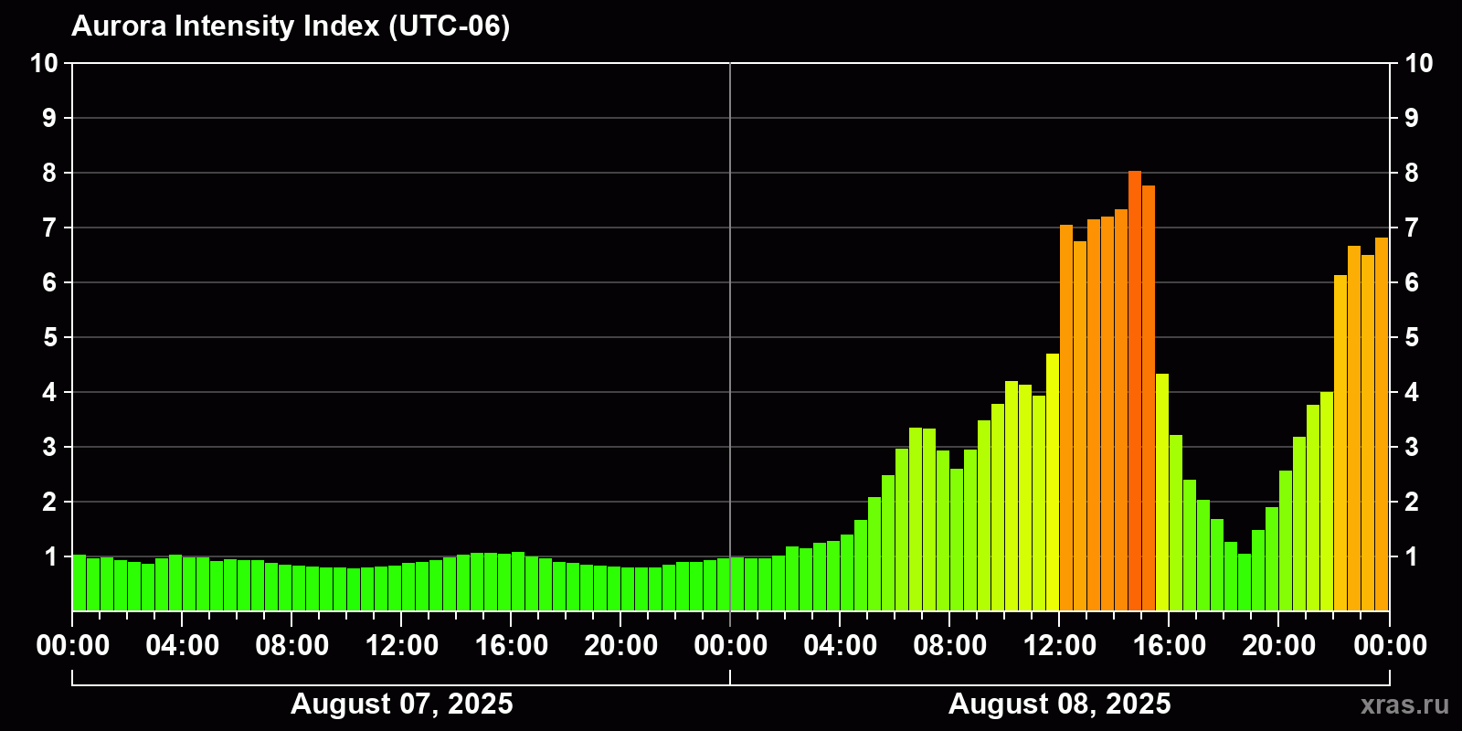 Changes in the auroral intensity index from 2025-08-07 to 2025-08-08 local time