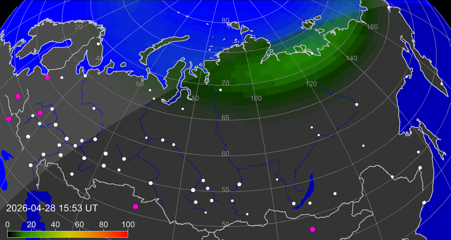 Northern lights (auroras) over the territory of Eurasia