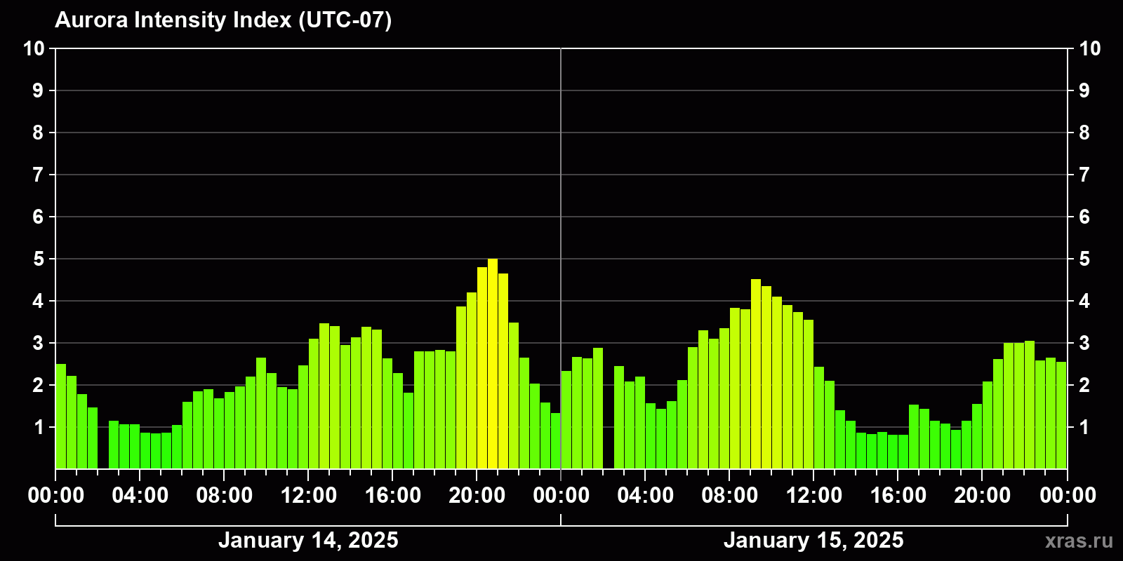 Auroral intensity index and the theoretically possible latitude of observations for nighttime in the Western Hemisphere as of 2025-01-15 23:59 (end of day) local time
