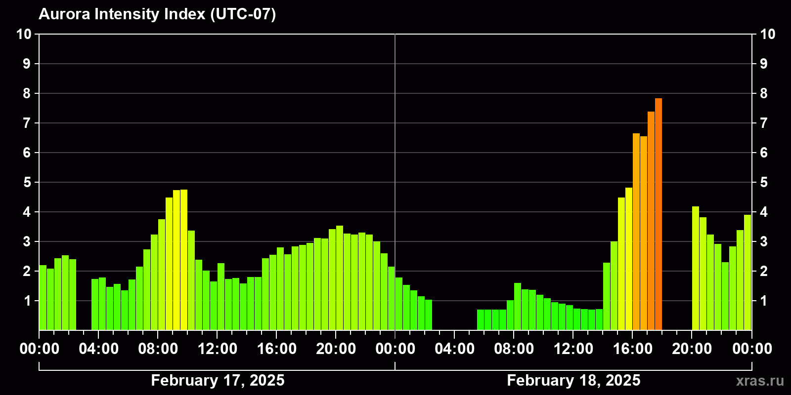Auroral intensity index and the theoretically possible latitude of observations for nighttime in the Western Hemisphere as of 2025-02-18 23:59 (end of day) local time