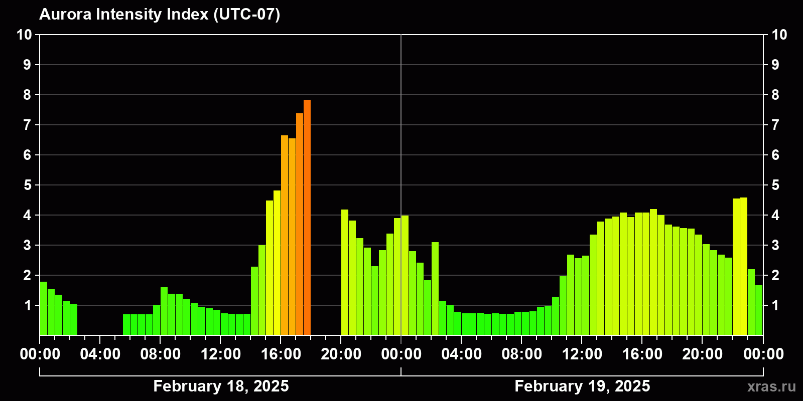 Changes in the auroral intensity index from 2025-02-18 to 2025-02-19 local time