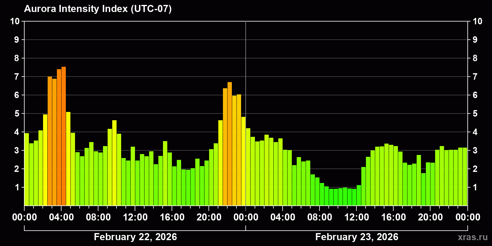 Auroral intensity index and the theoretically possible latitude of observations for nighttime in the Western Hemisphere as of 2026-02-23 23:50 (end of day) local time