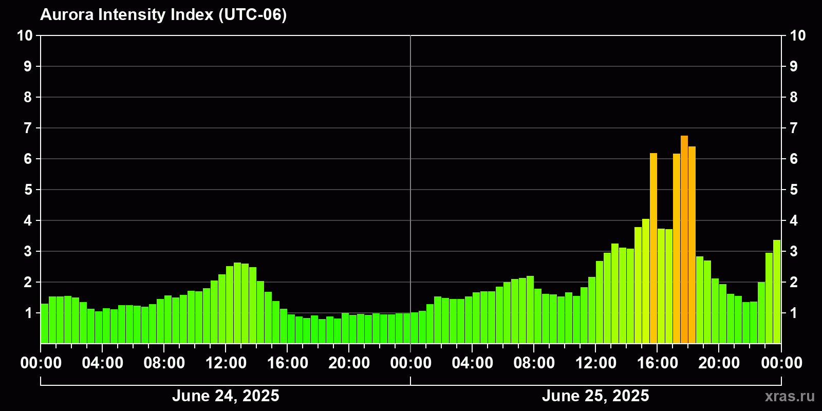 Auroral intensity index and the theoretically possible latitude of observations for nighttime in the Western Hemisphere as of 2025-06-25 23:52 (end of day) local time