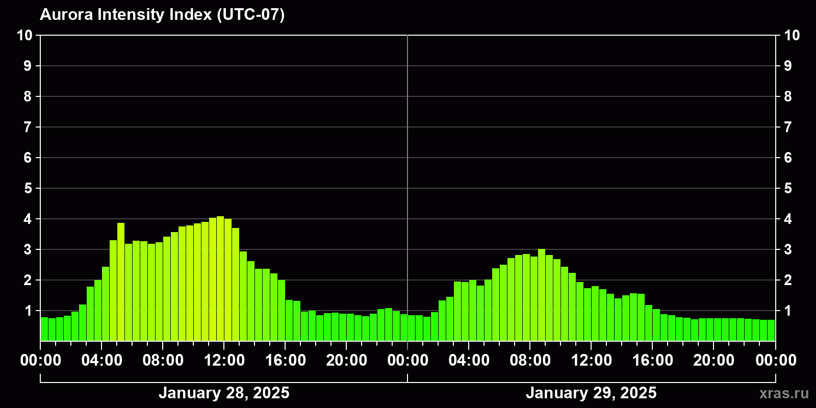 Auroral intensity index and the theoretically possible latitude of observations for nighttime in the Western Hemisphere as of 2025-01-29 23:57 (end of day) local time