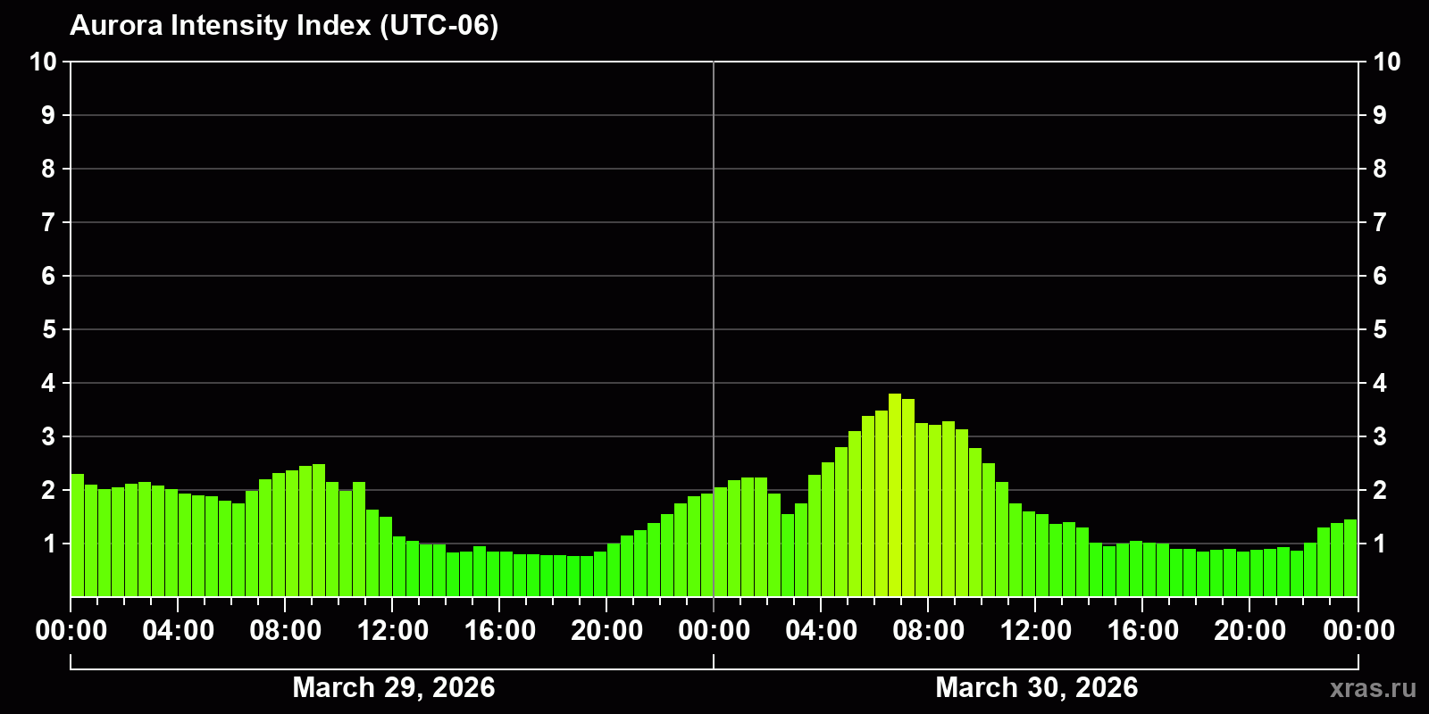 Changes in the auroral intensity index from 2026-03-29 to 2026-03-30 local time