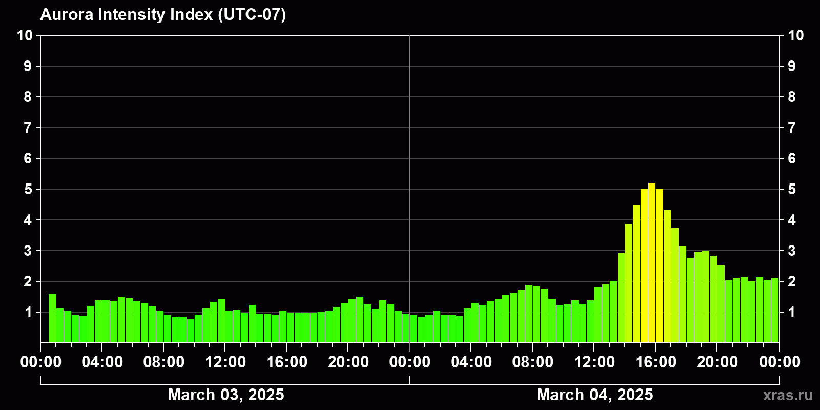 Auroral intensity index and the theoretically possible latitude of observations for nighttime in the Western Hemisphere as of 2025-03-04 23:57 (end of day) local time