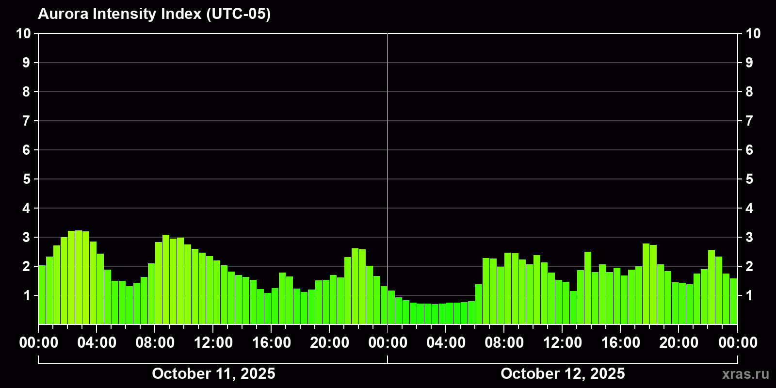 Changes in the auroral intensity index from 2025-10-11 to 2025-10-12 local time