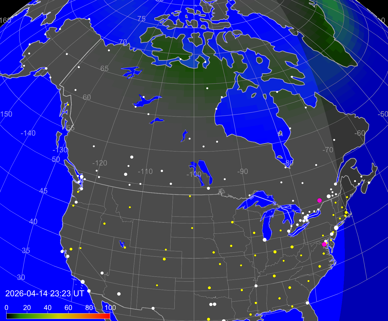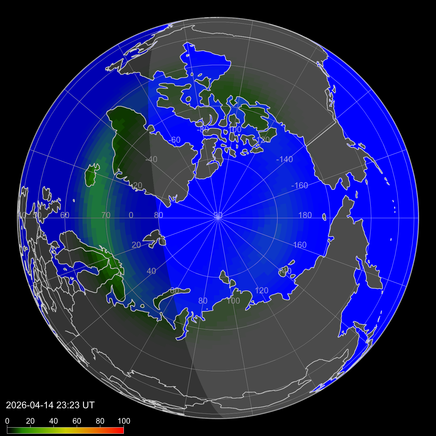 Changes and hourly forecast of the auroral intensity index from 2026-04-13 to 2026-04-14